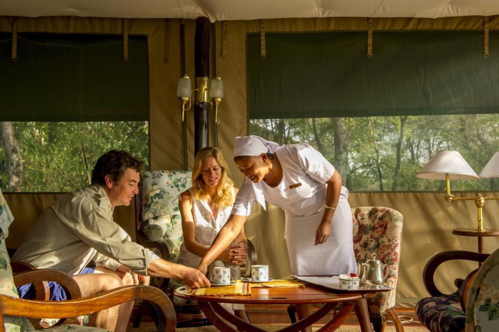 In keeping with the theme of colonial opulence, the elegant dining tent features Edwardian-styled furniture, crisp-starched napery, delicate blue and white china and silver accoutrements, whilst the staff are attired in classical colonial 'mess' uniform of white Swahili robes.