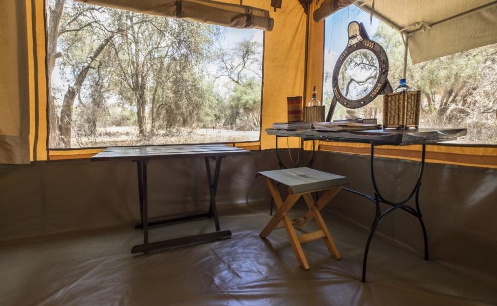 Each tent contains a double and single bed with bedside tables with LED solar bed side lamps, a torch, wardrobe for hanging your clothes, luggage rack, en-suite W/C with a walk-in bucket shower, wash basin sink and a writing desk with a solar lamp. There are chairs and a table on the veranda for relaxing.