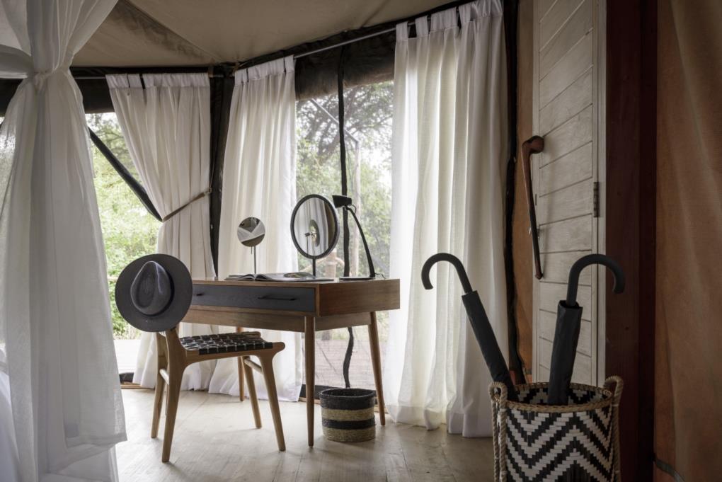 Each tent has a private deck and an en-suite bathroom with indoor and outdoor shower, and features a spacious open plan arrangement with comfortable king or twin beds, campaign chairs and plush sofas. A hair dryer, ceiling fan, in room safe and mosquito nets are available in all tents.