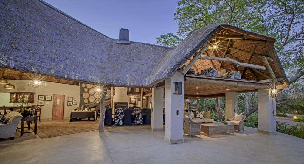 The lounge and dining room is an impressive building under thatch, which is perfectly positioned with a view of the beautiful swimming pool and a few metres further, the waterhole. Guests can also enjoy game viewing in comfort from the upstairs library. There is also a well-stocked curio shop. The open air boma, also overlooking the floodlit waterhole, creates a warm, friendly atmosphere, where guests may enjoy a traditional African meal under the stars. The boma has a thatched bar and cooking area. There is also a small gym.