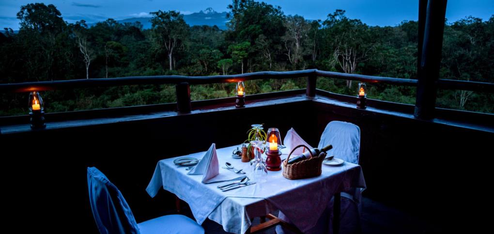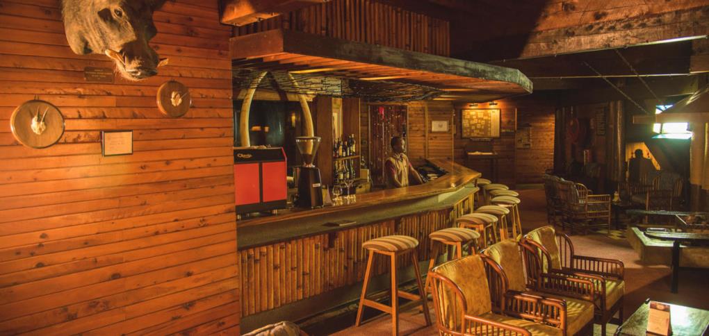 The central dining room is raised to tree level offering long views over the forest canopy. All meals are served on a buffet basis and showcase both local and international cuisine. The panelled bar is decorated with scenes from Kikuyu life and features a central fireplace and access to the viewing platform over the waterhole.