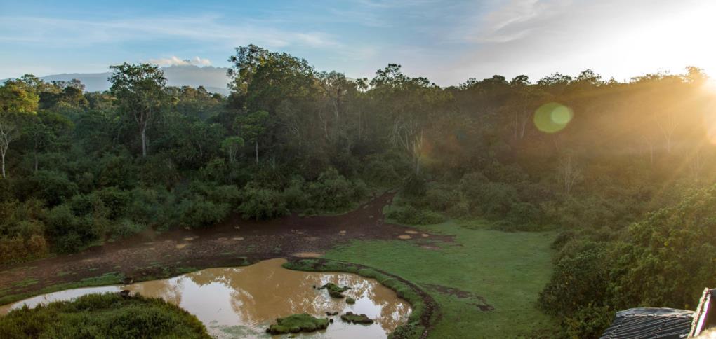 Located at 2,134 metres above sea level, on the lower slopes of the mountain, the lodge is cool, tranquil and hushed for optimum game-sightings. The open-air viewing-deck looks down on to its own water hole and salt-lick, which attracts numerous herds of elephant and buffalo.