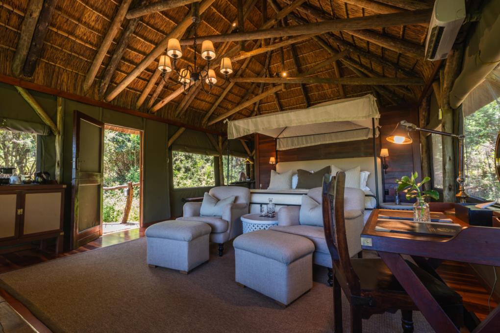 The luxury en-suite safari tents have canvas walls and thatched roofs, and are perched at “tree top” level offering spectacular views over the thickly-wooded valley.