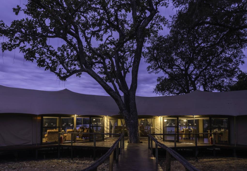The main camp area includes a dining room, lounge, and bar along with a shaded outdoor deck for alfresco dining experiences.